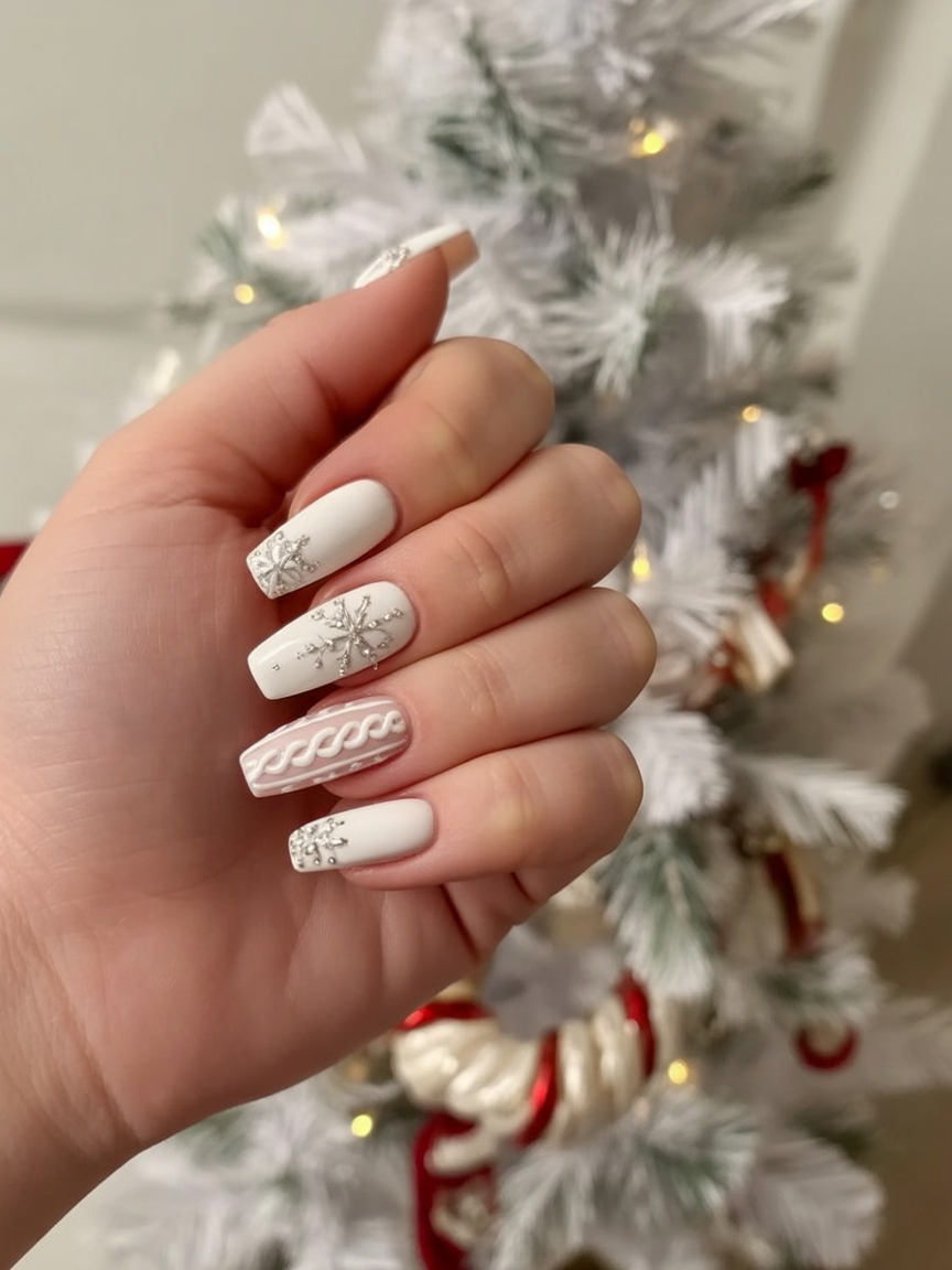 What makes this manicure unique is its blend of textures. The combination of sweater designs, snowflakes, and crisp French tips gives it depth and interest, making it one of the most creative ideas for Christmas 2025. Best suited for long square acrylic nails, it’s a bold but classy option.