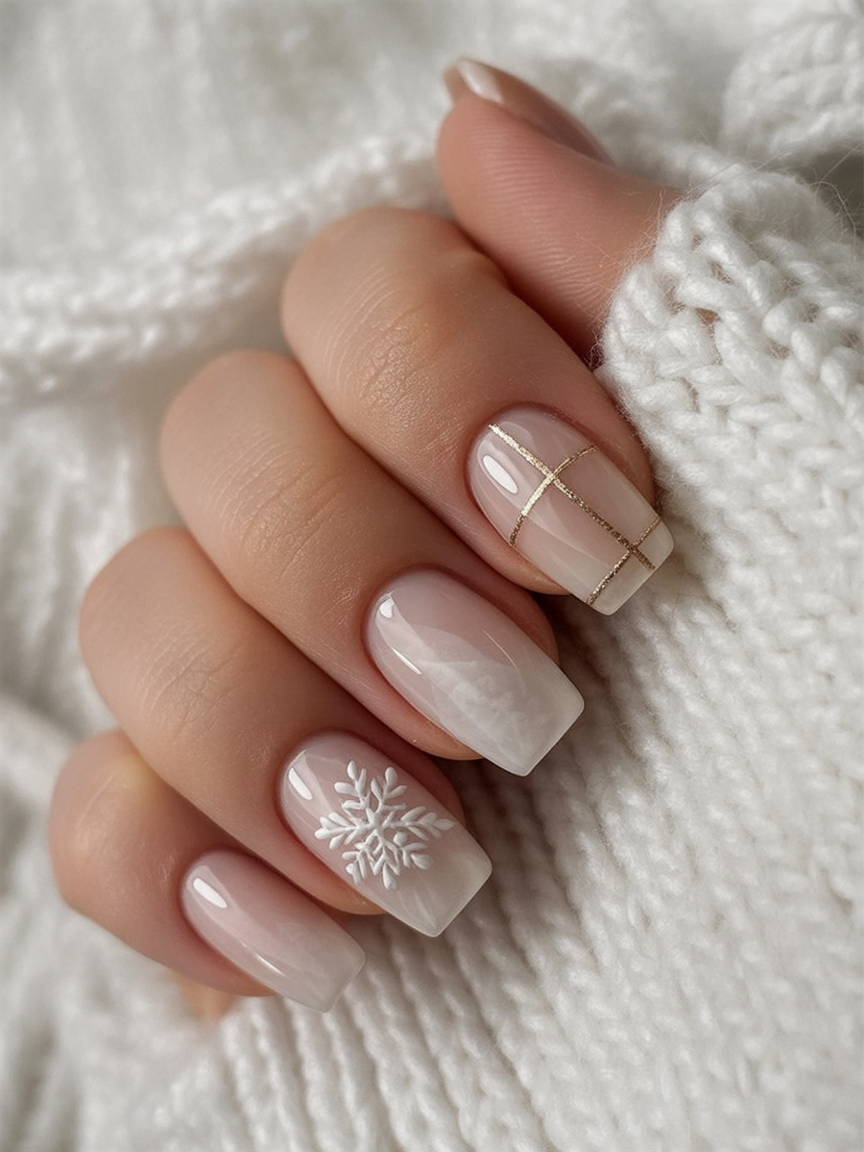 Quiet luxury is what the manicure exudes. The soft ombré base smoothly meshes with an elegant snowflake accent, while the fine golden lines add grandeur. It is like cuddling in a cashmere sweater by the fireplace — understated, elegant, and timeless. This is the kind of nail look that effortlessly complements both casual knits and elegant holiday dresses.
