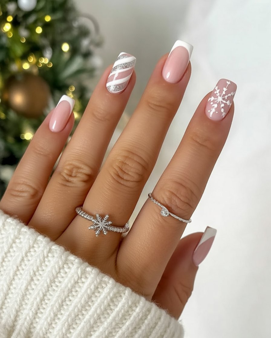 Now, classic French meets all things festive: think candy cane stripes, glitter, and snowflakes tied up with a nude base. It’s glamorous chic with a true nod to the season, making it the choice nails to come to appropriate office parties while raiding Christmas Eve gatherings with style.