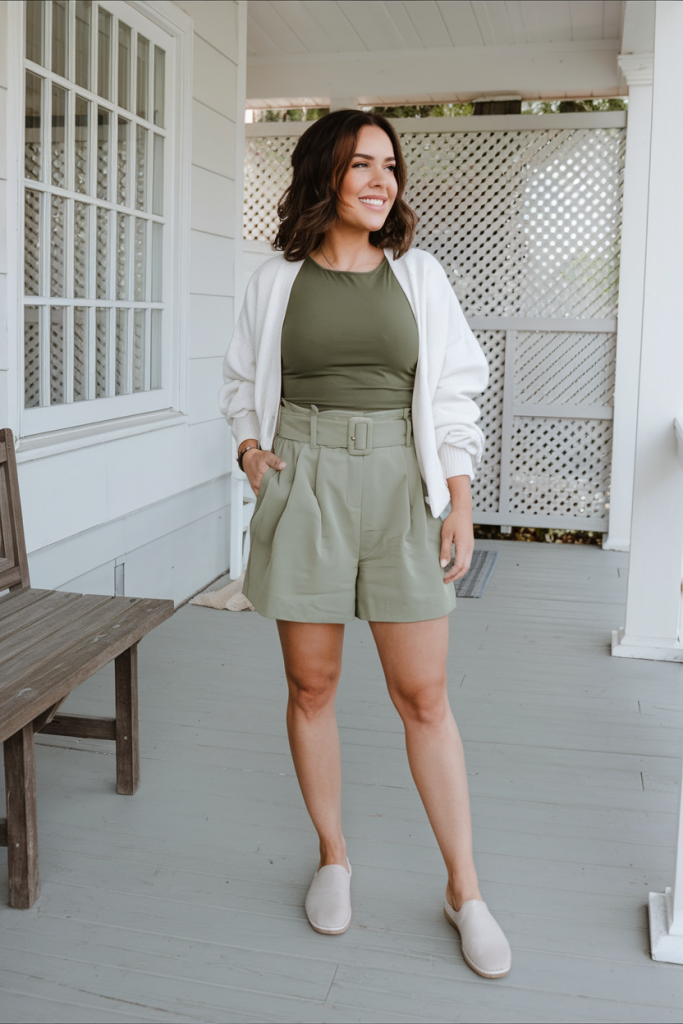 For a refined casual summer look, this outfit pairs high-waisted sage green shorts with a fitted olive top and a soft, oversized cotton cardigan. The structured shorts create a flattering silhouette, while the white cardigan adds a relaxed touch. A pair of neutral slip-ons keeps the look effortless and comfortable.
