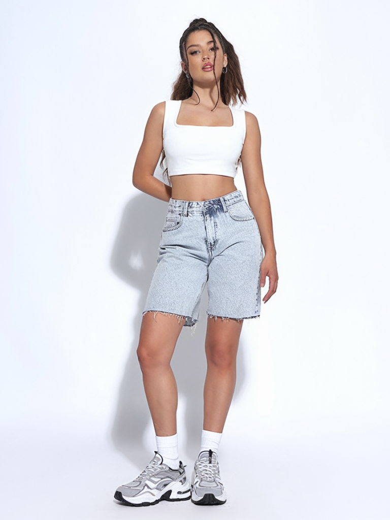 Long, relaxed denim shorts paired with a fitted white crop top and chunky sneakers create the ultimate grunge-meets-streetwear aesthetic. This outfit is perfect for an effortlessly cool casual day, a summer festival, or even a laid-back school outfit.