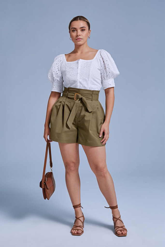 Nothing says casual summer elegance like a structured pair of high-waisted shorts paired with a delicate eyelet blouse. This outfit captures the essence of effortless sophistication, perfect for a weekend brunch or a vacation stroll. The crisp white blouse with its puffed sleeves adds a romantic touch, while the olive-green shorts with a belt detail bring definition to the silhouette.