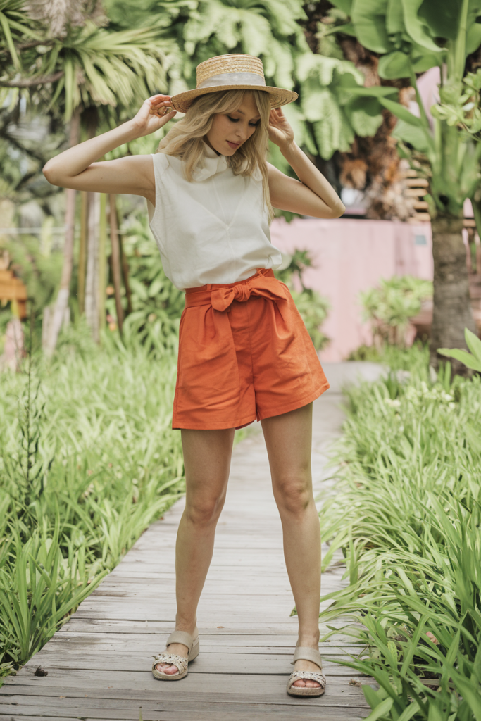 Bold hues continue to dominate summer fashion, and these vibrant orange linen shorts are a must-have for warm-weather adventures. The high-waisted silhouette, complete with a fabric belt, cinches the waist beautifully, while the airy sleeveless blouse ensures comfort in the heat. A straw hat and woven sandals complete this effortlessly stylish vacation-ready look.