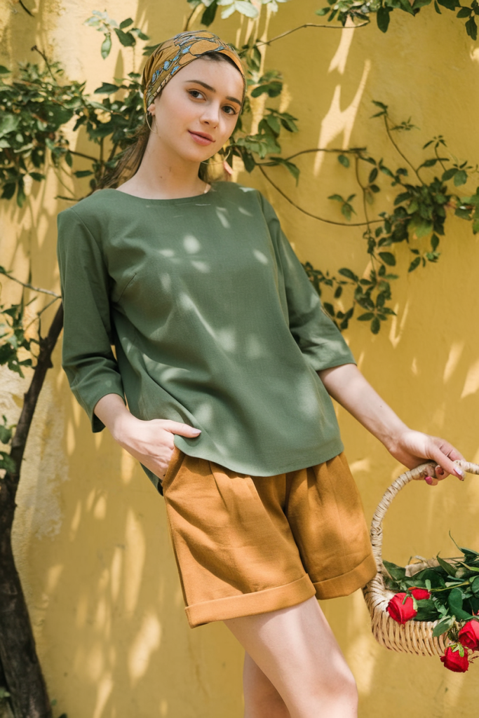 Channeling a timeless bohemian aesthetic, this outfit plays with linen textures and muted earth tones. A loose, cotton olive blouse pairs effortlessly with cuffed camel shorts, creating a look that’s as stylish as it is comfortable. The printed headscarf adds a vintage touch, making this a great grunge or cowgirl-inspired outfit.
