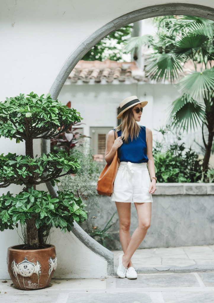 Elevating shorts for an elegant vacation look, this ensemble features crisp white high-waisted shorts paired with a structured navy tank. A straw hat and oversized tote add both practicality and charm, while white sneakers balance comfort and style.