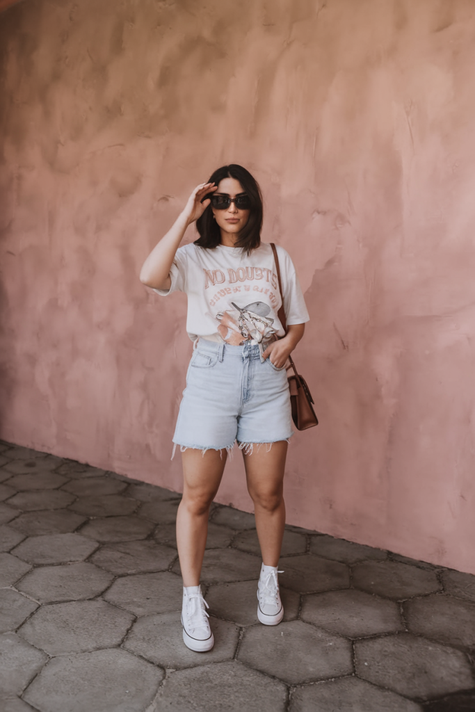 Bringing back classic denim energy, this outfit pairs a vintage-style graphic tee with jeans shorts. The relaxed fit and raw hem give off a grunge feel, while high-top sneakers add a sporty touch.