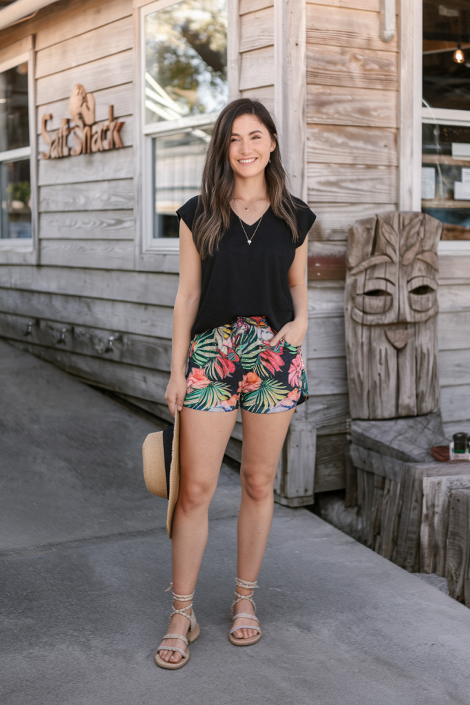 For those who love a pop of color, this look features vibrant floral shorts paired with a classic black blouse. The tropical print exudes summer fun, while neutral sandals and a straw hat keep the look balanced and stylish.