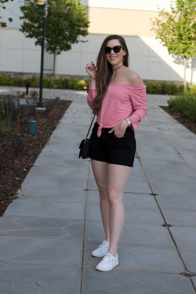 This off-the-shoulder pink top with black high-waisted shorts creates an elegant yet relaxed look. The knotted detail on the top adds shape, while the crisp black shorts provide contrast. Paired with white sneakers and a sleek black crossbody bag, this look is perfect for a casual day out or even a birthday brunch.