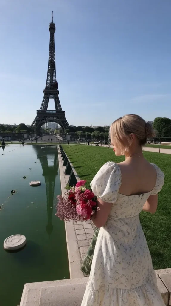 This look feels effortlessly romantic in a very real-life way. Soft trousers, a simple top, and comfortable shoes create an outfit that doesn’t try to steal the scene—yet somehow fits perfectly into it. Walking through a quiet Paris street with the Eiffel Tower peeking behind feels intimate, calm, and grounded, like one of those travel memories that stays warm in your chest long after you’re home.
