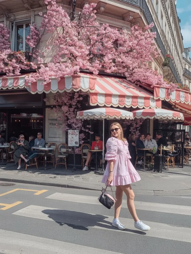 This look feels like stepping into a postcard. The soft pink dress against blooming trees and café tables is pure Parisian charm. It’s sweet, light, and effortlessly photogenic—perfect for those spring days when the city feels alive and romantic.
