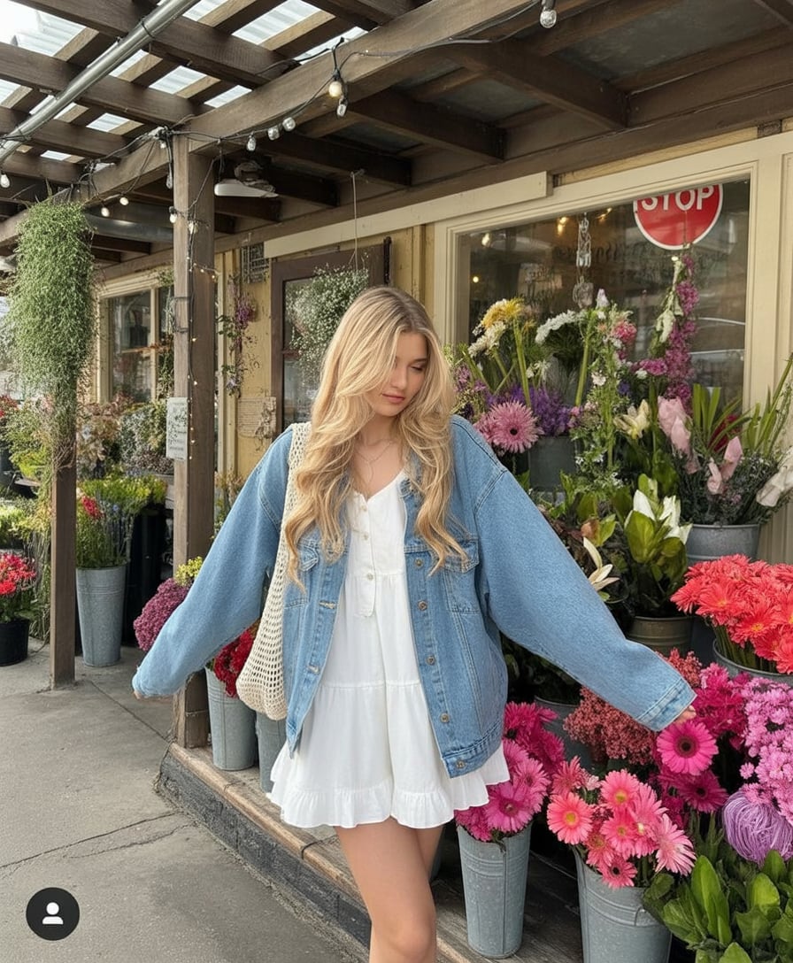 There’s a romantic ease to this look that feels straight out of a Parisian daydream. A soft white dress layered with an oversized denim jacket creates that just-threw-this-on magic we all chase. Standing among flowers, it feels youthful, light, and full of quiet joy—perfect for May, when the city starts to bloom and everything feels possible again.