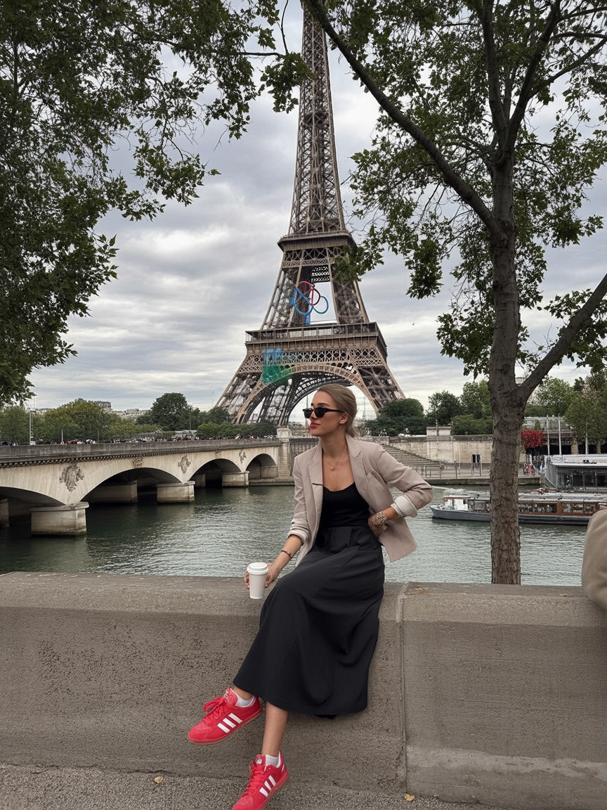 This outfit feels modern, confident, and perfectly suited for a cool Paris morning. A neutral blazer layered over a flowing black skirt creates a beautiful contrast between structure and movement. Holding a coffee by the Seine, it feels like the kind of look that works anywhere—from sightseeing to a casual lunch.