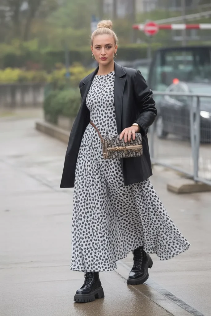 This outfit balances softness and strength in the best possible way. A flowing printed dress meets a structured leather jacket, creating contrast that feels modern and confident. It’s the kind of look that says you can be feminine and powerful at the same time—no compromises needed.