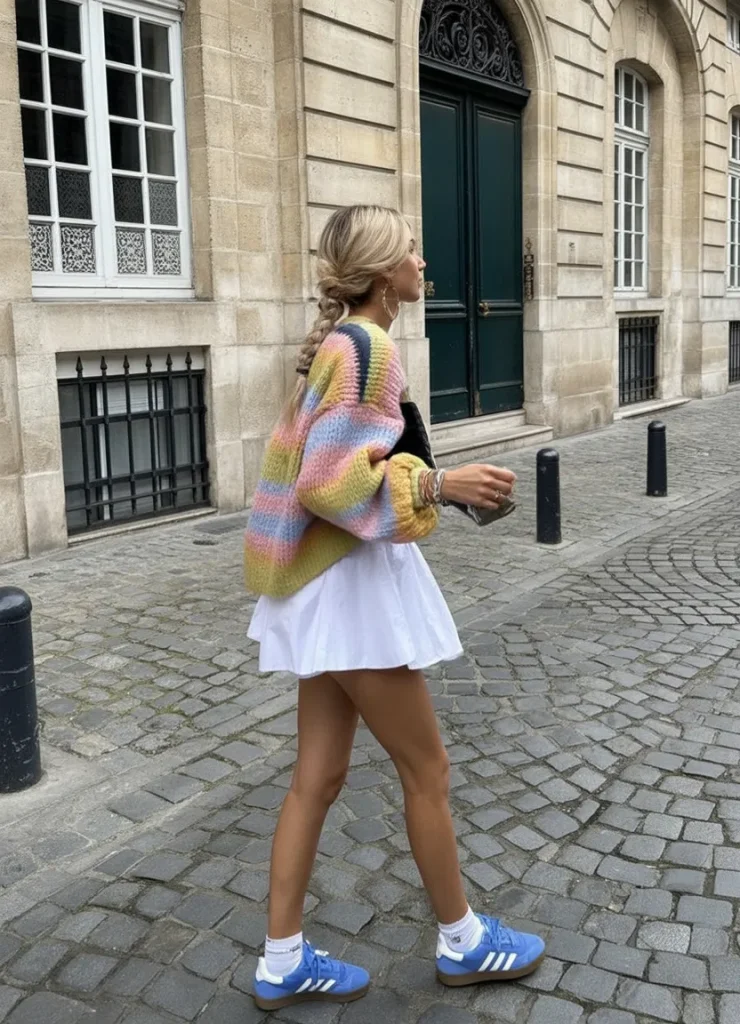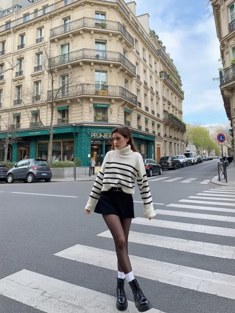 This look feels cool, confident, and very now. A cozy striped sweater paired with a mini skirt creates that effortless balance between comfort and style. Walking through the city, it feels relaxed but intentional—like you know exactly what works for you.