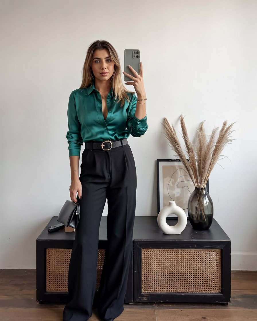 15. Emerald Satin Shirt with Tailored Black Trousers