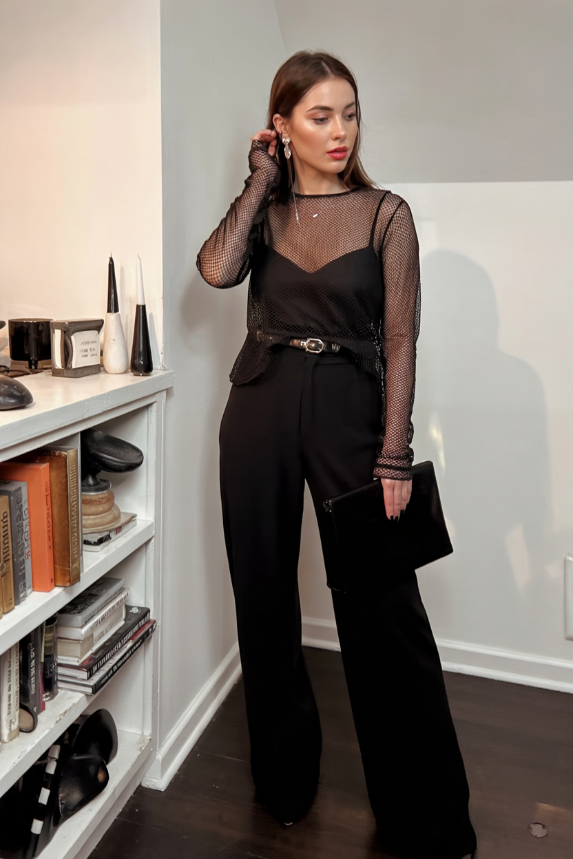 To top it all off—and to top everyone else off too—the whole vibe is playful glamour with grown-up polish. You get the fun of the sequined mini skirt without feeling like you’re exposing too much of yourself, and the high-waisted trousers are super flattering on all body types, especially if you prefer the smooth line through the hips and stomach. Throw in some strappy stilettos for the night ahead, keep jewelry simple, and perhaps finish off the look in the bar for more of an ‘office ready’ vibe before the night gets underway. Once the tunes are on, the fringe speaks for itself.