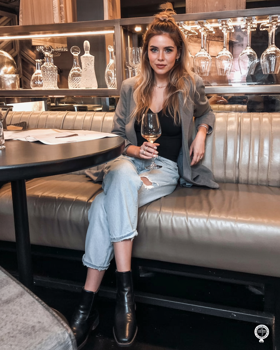 Of course, the most relaxed outfit in your wardrobe is the one that looks the least like you tried at all. And let’s face it—it’s the go-to outfit for that night that starts out being just a glass of wine on the way home from work but turns into an all-night event. It hits the mark of being effortless yet still polished enough to let everyone know you’re the kind of woman who always lands on her feet.
