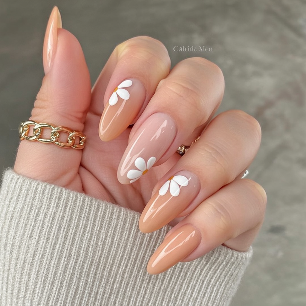 22. Daisy-Tipped Peach Almond Nails