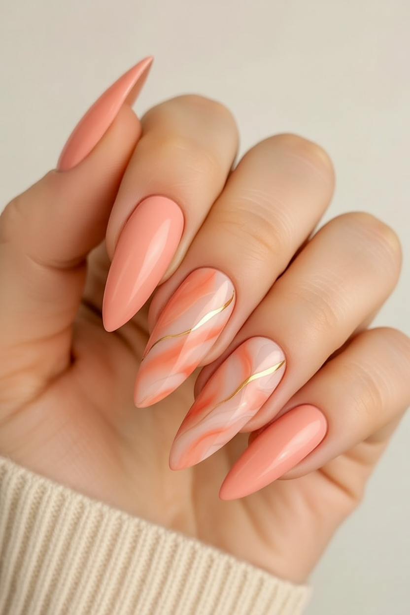This look is particularly complementary if you have naturally medium-length nails or like to wear a slender acrylic tip because the tapered almond shape elongates the finger. Request your nail artist for sheer layers instead of opaque color to maintain a light and fluid look for the marble effect, and ensure your gold details are very thin for a chic 2026 interpretation of peach nails. A high-gloss and nearly glaze-like topcoat will greatly accentuate the lighting effect and provide you with just the subtle chrome catch to delightful effect no matter the lighting, at daylight or night.