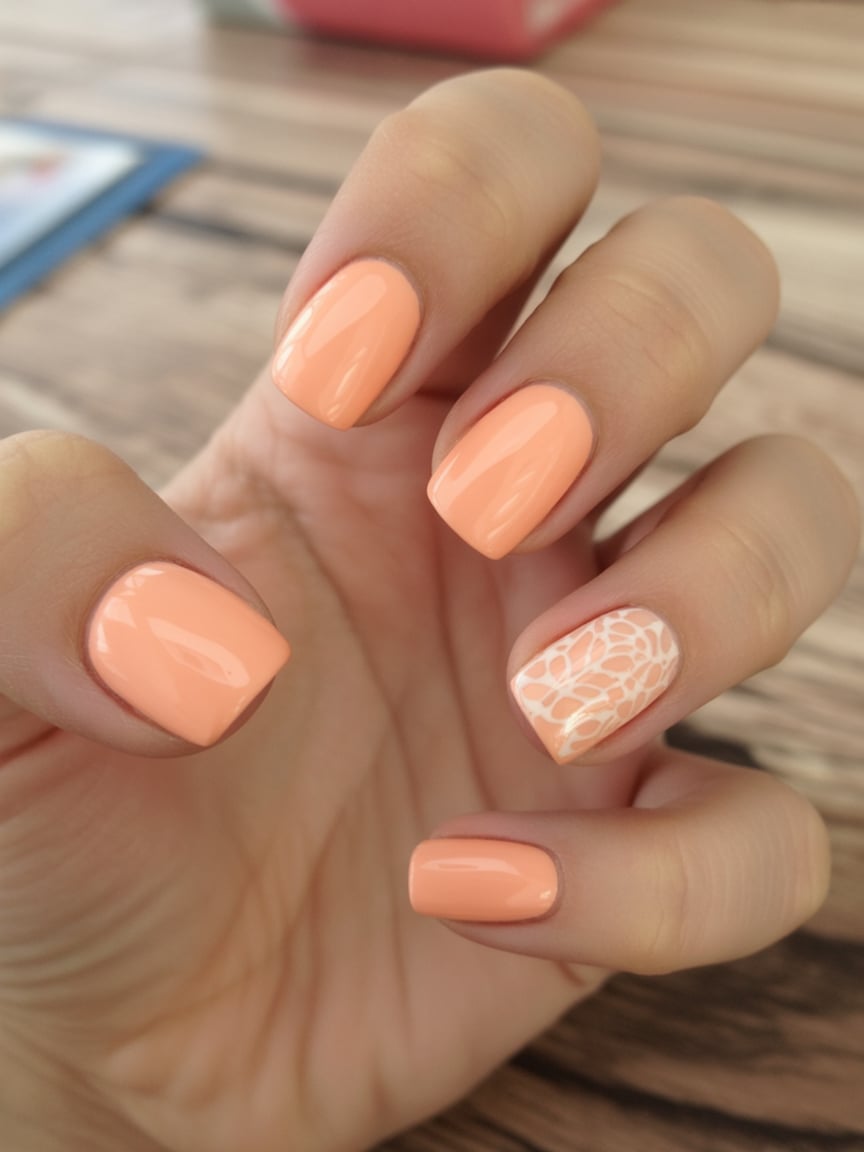 7. Short Peach Lace Accent Nails