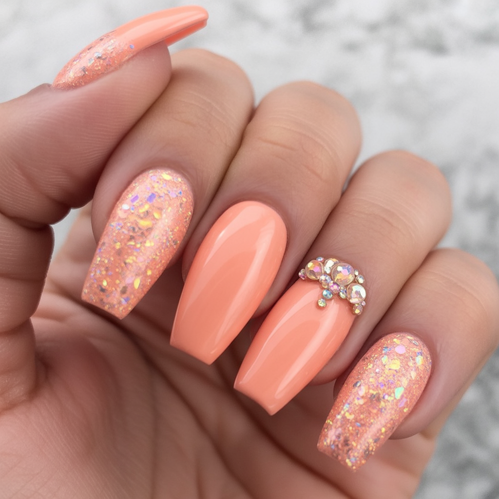 As a magpie at heart who loves sparkly details, peach nails like these bring pure delight to those who love such sparklies. The peach-colored topcoat itself feels like biting into a juicy peach because it is this creamy and dreamy to the visual sense. Meanwhile, fingers have large chunks of glitter that sparkle in minute flashes of light with every gesture. In one of them is a small arch of crystals to form a quiet princess vibe without going too cosmetically over-the-top.
