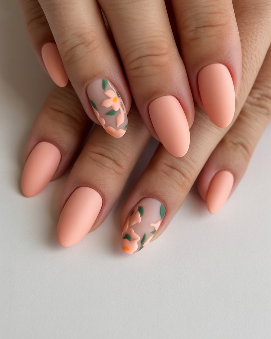 This collection of matte peach nails is like your little secret garden that you can take with you everywhere. To begin with, it seems like the majority of the nails have a soft peach finish that makes your hands immediately look smoother and more elegant. But to add to their one-of-a-kindness is the small floral artworks on the statement fingers with peach and green leaves that seem to exude a refreshing