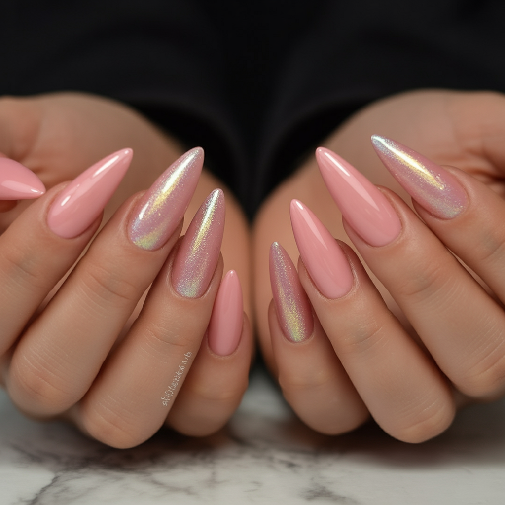 These peach chrome nails feel like jewelry all on their own. The base is a creamy pink-peach that already looks luxurious, but the chrome shimmer on a few nails transforms the whole set into something truly eye-catching. When the light hits, the surface flashes like a shell, giving that glazed, metallic glow everyone loves. Paired with the long, tapered tips, the overall effect is full Princess energy in the best possible way.
