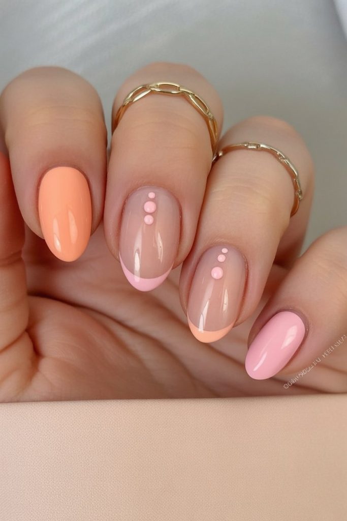 “This cute look is like a sherbet bomb going off in your world. The tip begins with a peach color on one finger and then a simple pink option on another. But then it moves to have a sheer finish with minuscule dots to finish it off with thin tips. While there is only a subtle presentation with peach and pink hues, this “pattern” is given a cool touch with little dots strategically placed on your fingers. It is cute and just the right amount of extra to see every day to be like, ‘Yes. That peach nail art statement I made back in 2026 paid off.’” This is a beautiful option if you like shorter to medium lengths and prefer something that suits your busy and hands-on lifestyle. This type of nail is perfectly suitable for oval-shaped nails or if you have a thin layer of acrylic tips. Since there’s no base on two of your nails, it means your growth isn’t as apparent. This makes it one of those styles that you can just wear over the course of your entire summer season with only one appointment at the salon every season—a no-brainer for every woman who is serious about beautiful nail artwork yet refuses to live in their salon!