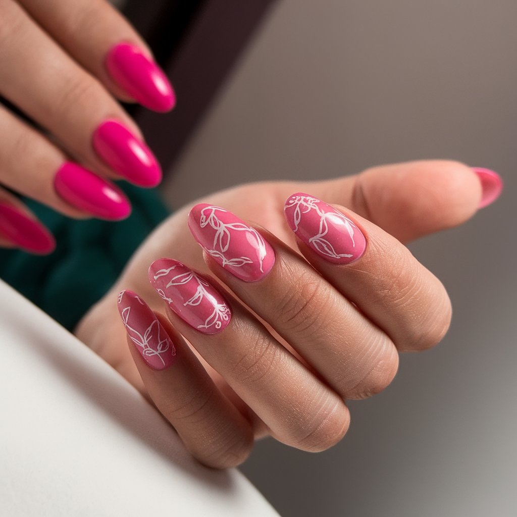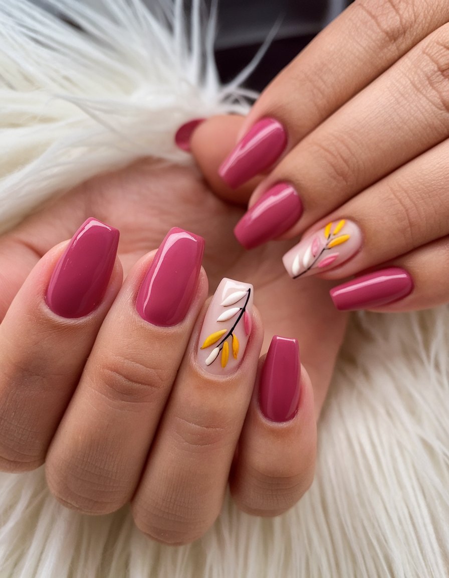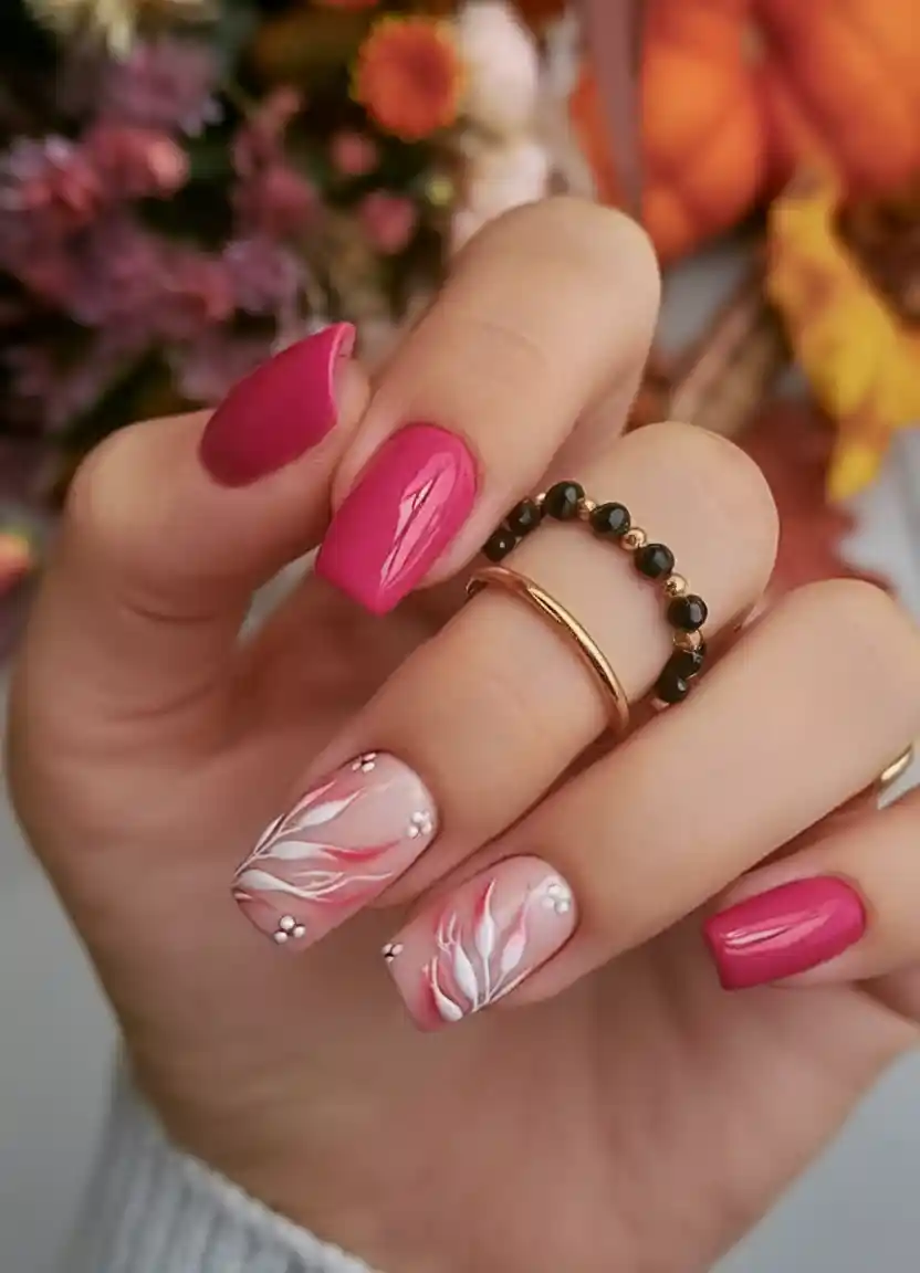 Hot pink nails, however, are an edgy variation of fall. Its white botanical interlines offer a touch of whimsy to the in-your-face pink ground, to ensure you bear in mind that not every autumn has to be full of neutrals. It is dedicated to the woman that cannot diminish the glow because the days are becoming colder.