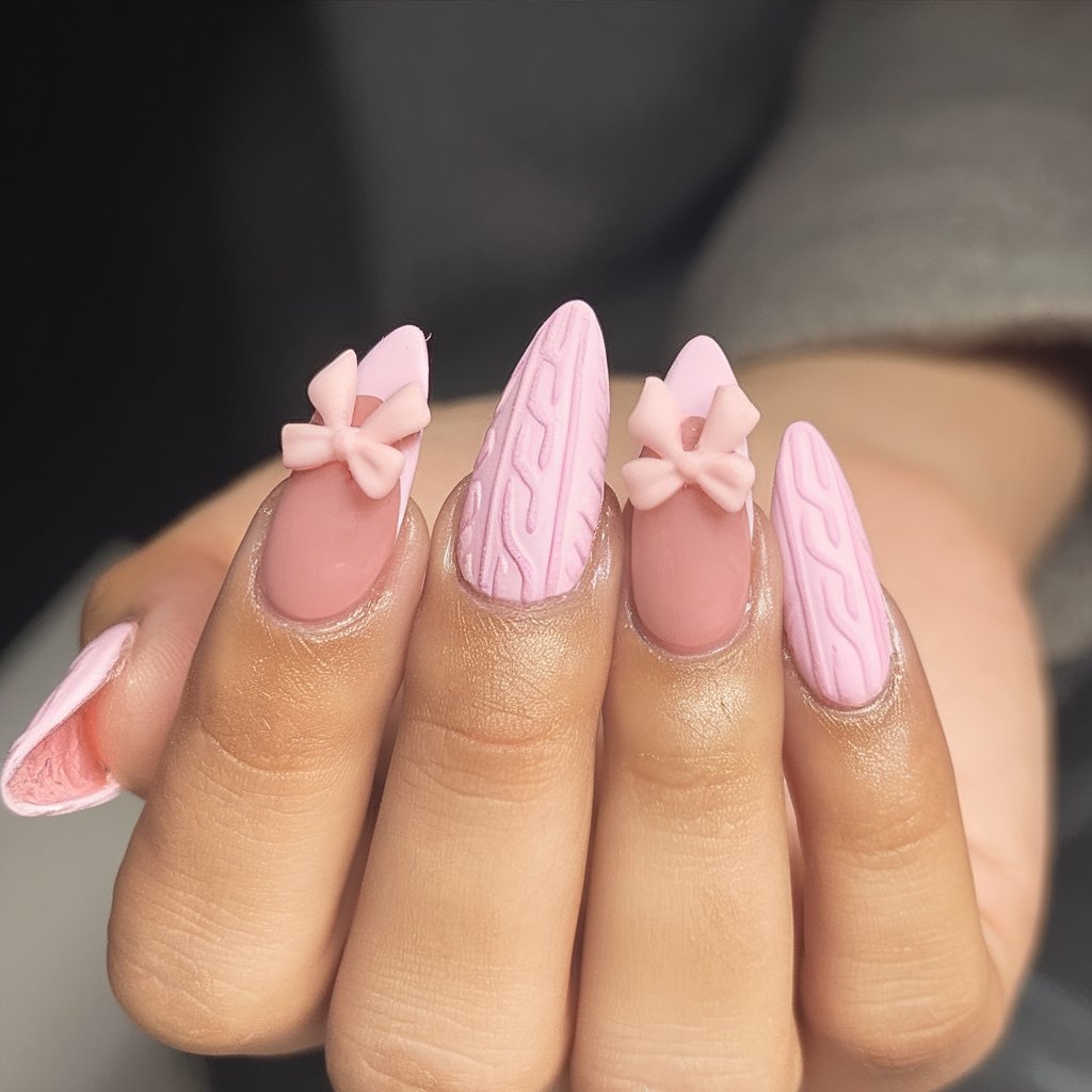 Glitter lovers, this one’s for you. A combination of shimmery pink and glossy polish with a bright eye-catching bow-tipped nail, this inspo brings happiness to every wrist motion. It feels a little festive without being too loud; that is, suitable for the person who would like to celebrate the season in sparkle.