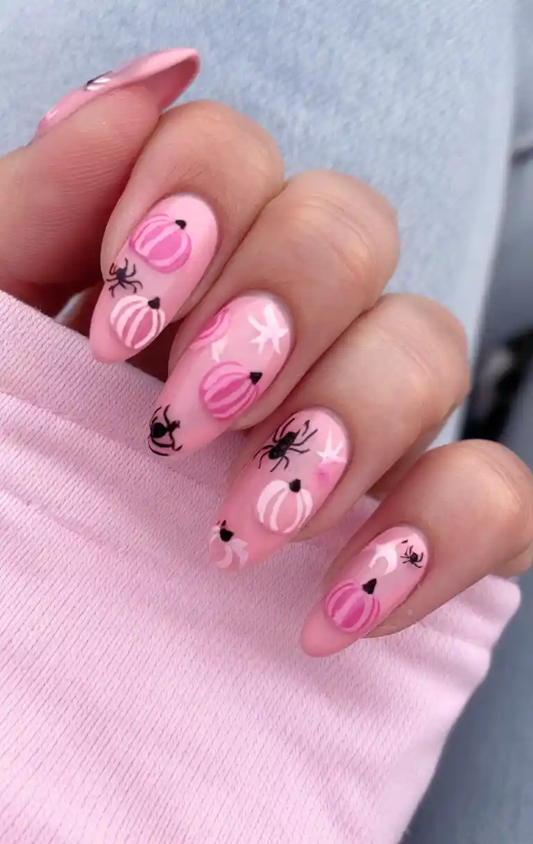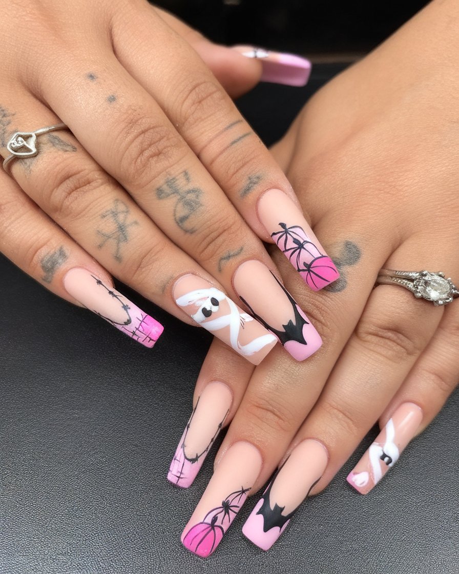 When Halloween but make it pink is your style then this will be your jam. It makes spooky season festive using spiders, bats, mummies, and pumpkins in pastel colors. These nails are just right between fun and trendy.