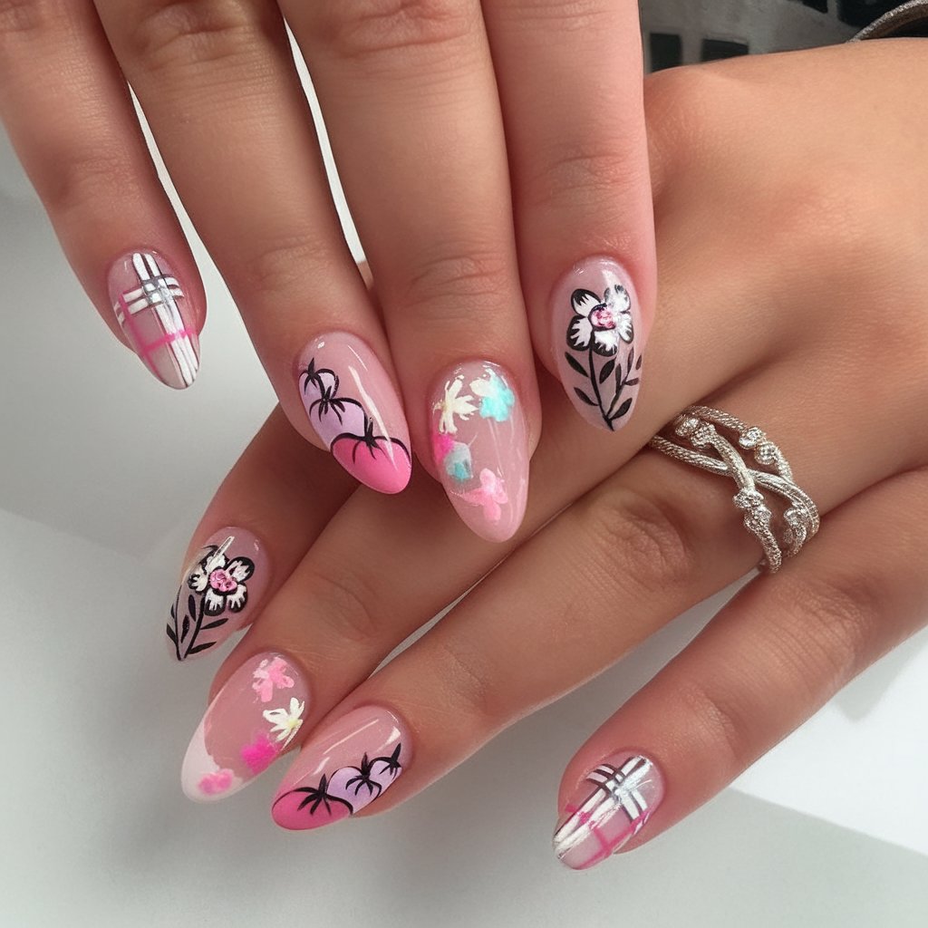 These nails bloom with personality. This form of art is a combination of a flowery florals, suggested plaid and free-styling strokes, exuding playful sophistication and a touch of an artsy air. Its shininess and variety of colors are light and expressive at the same time, such as when you spend an afternoon painting in your patio.