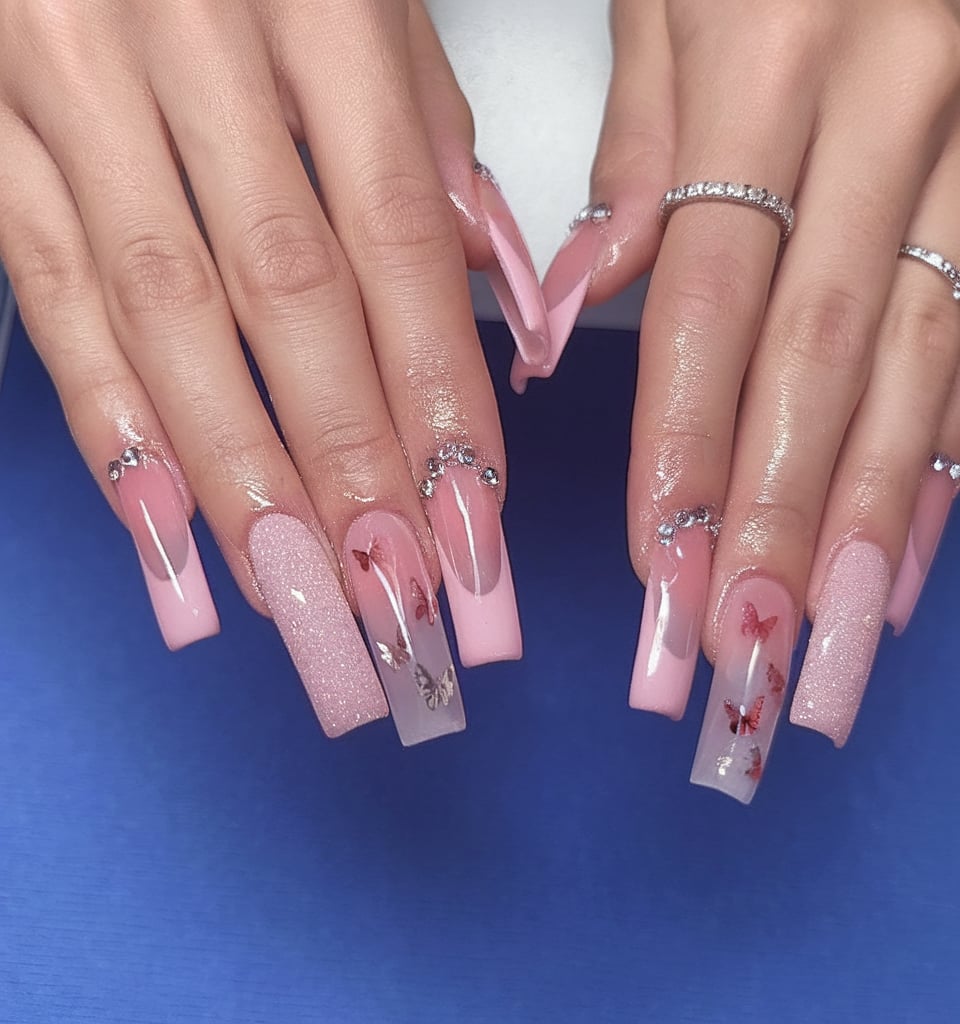 This set fits long square acrylic nails and provides a whimsical style to the appearance. Excellent to anyone that is obsessed with fine details and a pinch of glitter in their world.