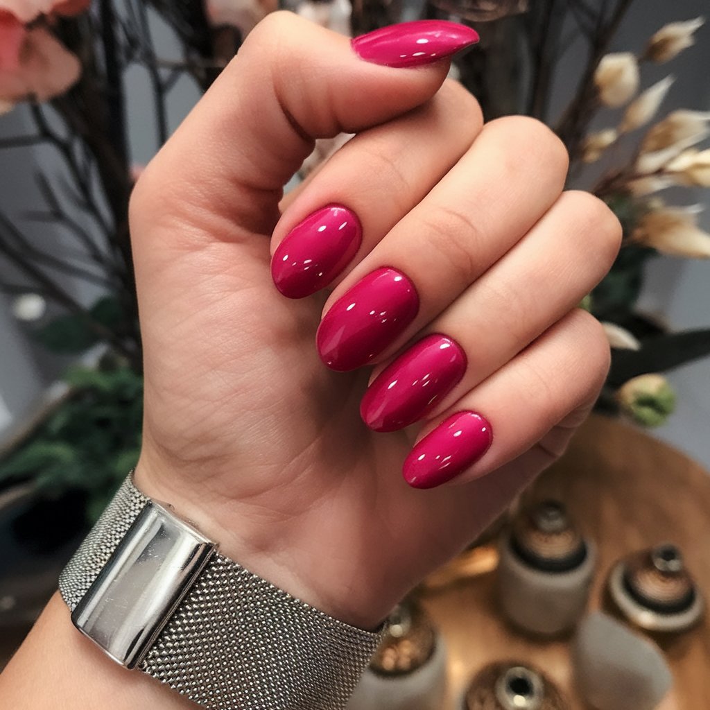 Classic never goes out of style. Seriously confident, these glossy raspberry nails don not require any sparkle or artwork to get noticed. These are the nail polishes that match everything and with any clothes in your wardrobe.
