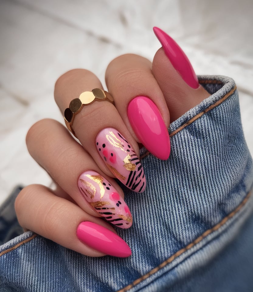 The nails make a complete vibe, a combination of polka art, polished dots and tiger strip additions enclosed in gold foil. The bright pink is all set to deliver, and it is the painted detailing which lends it an edge. It feels fresh, bold, and unapologetically fun.