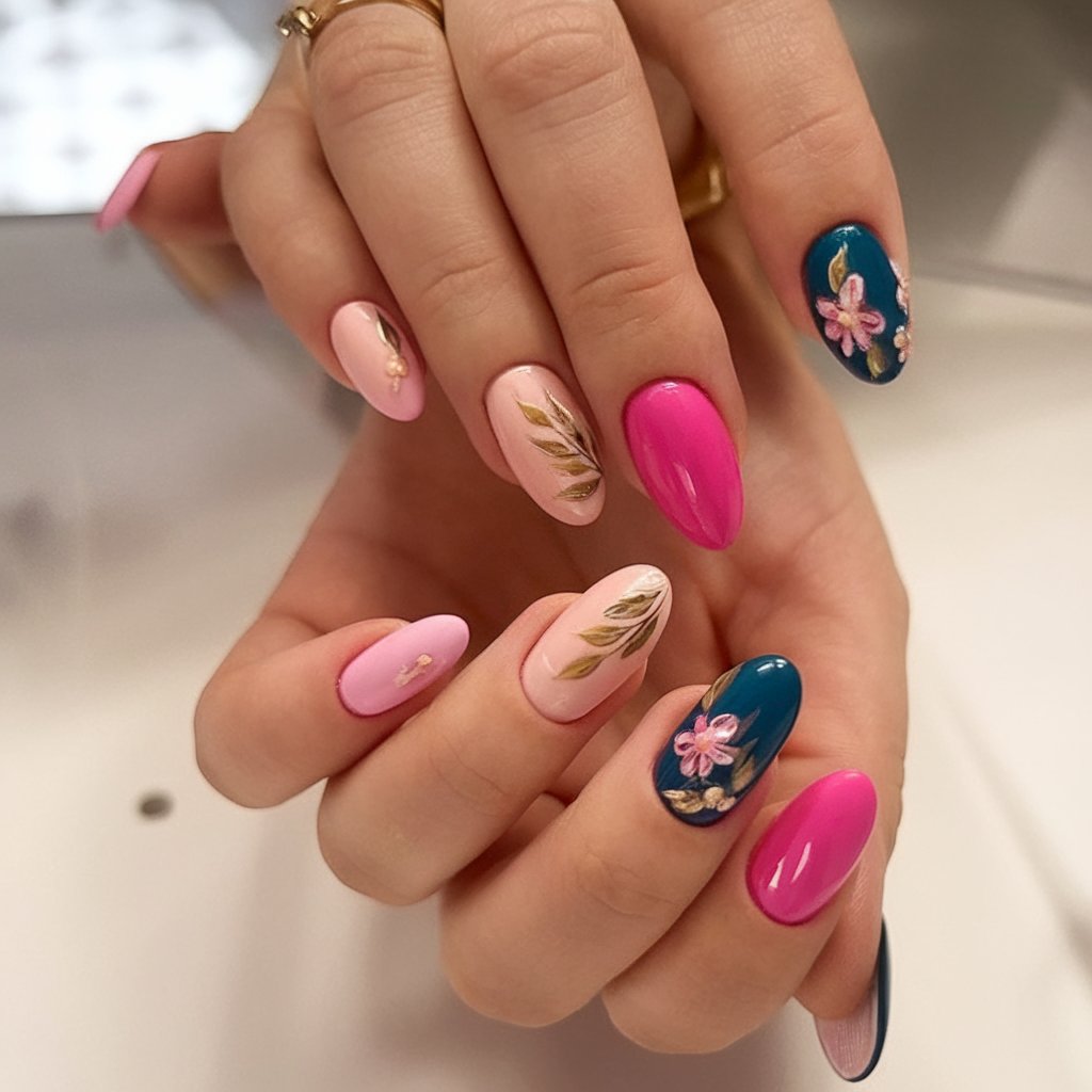 Whimsical, arty, and a bit theatrical, this set combines quintessence of autumn, such as golden leaves and floral decorations, with marvellous pinks and deep teal. It is like the type of nail art which will make people turn their heads and turn their moods up, so it is like having your favorite scarf and having your favorite statement earrings all together.