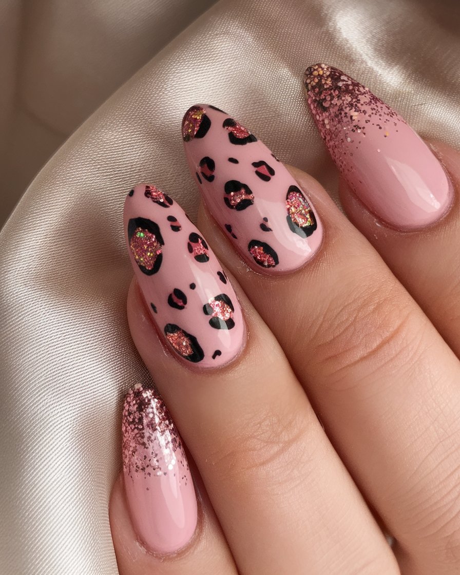 This look roars with personality while still staying playful. The leopard-like dots are accentuated with glitter, which makes them glamorous, but not excessive, and the pink tone is so subtle that it only implies the contrast to the animal print. It is one of those concepts which is on the edge of fierce and flirty.