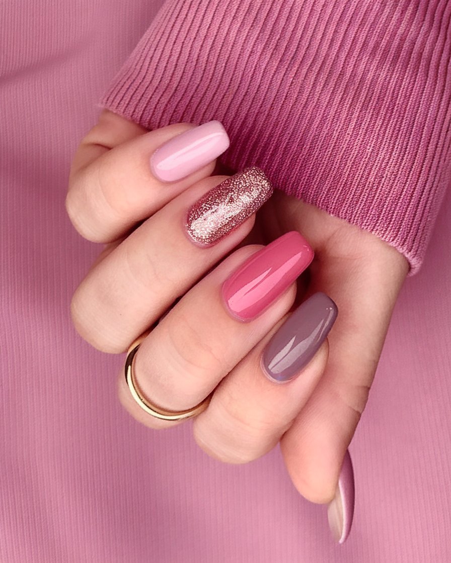 This design is a cuddly sweater on nail form, a dense combination of rose with mauve and soft pinks on top of which a glitter nail dominates the view. It is a kind of set that you will not get tired of wearing until October brunches and Thanksgiving dinners.