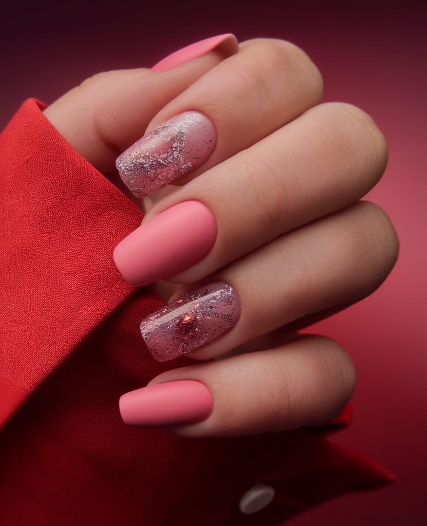 There’s a dreamy, almost cosmic energy to these nails. The base pink is matte and pretty with sweet touches on the skin but the accents with the sparkle are dimension or a swirl of stardust. It’s flirty, modern, and totally 2025.