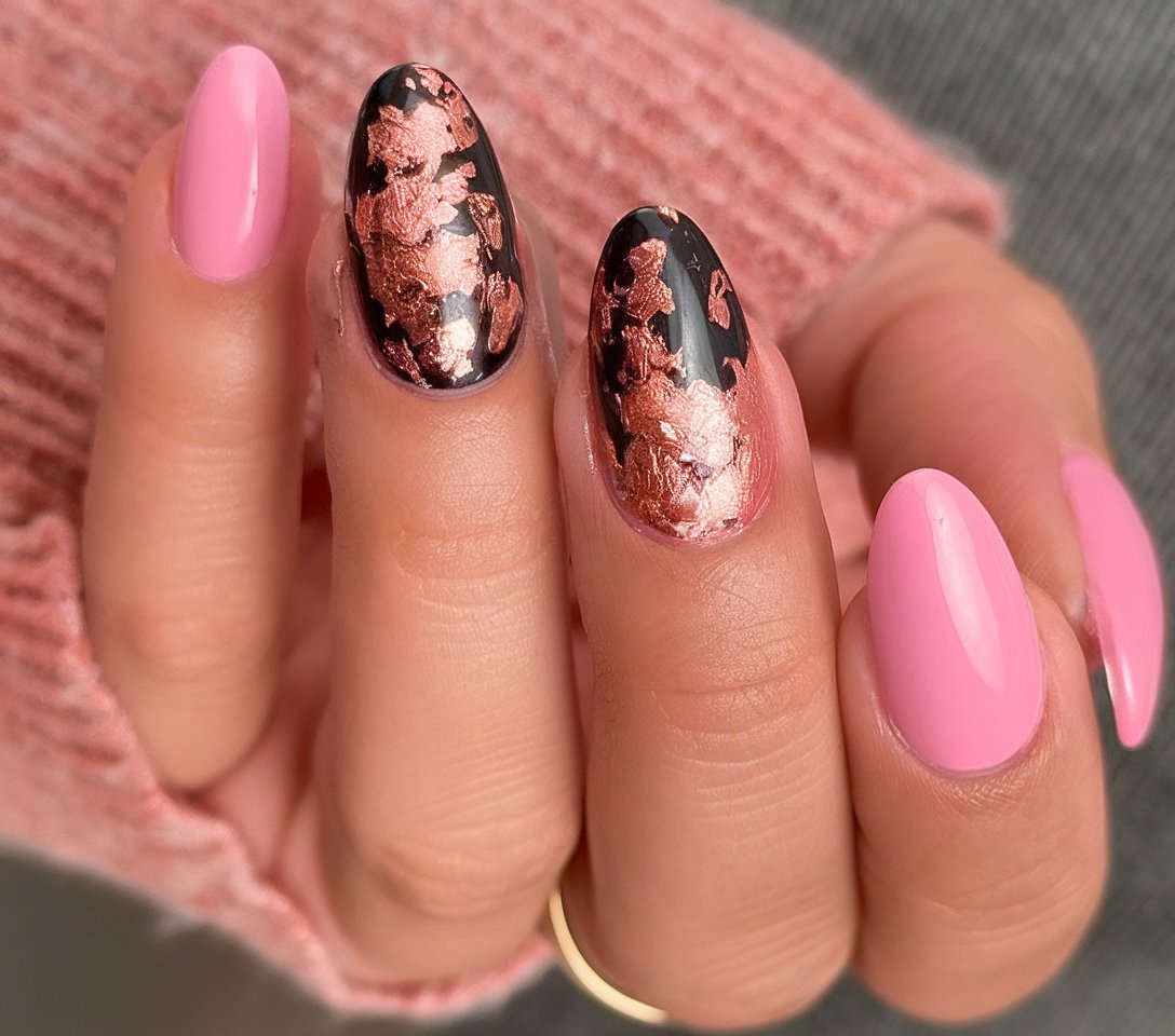 It is so crazy cool to combine soft and pale pinks with deep foil details. The theatric black and copper foil combo made these nails edgy but the vintage pink base brings it back to fall chic. It’s like having two moods in one set.