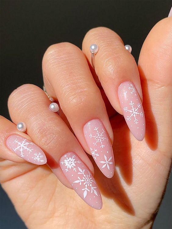 The first design showcases acrylic almond nails with a soft pink base adorned with white snowflakes. The almond nail shape elongates the fingers beautifully, while the delicate snowflakes bring a touch of winter magic to the look. This design is perfect for those who want something both festive and sophisticated. The light, natural tones of pink allow the intricate nail art to stand out without being overwhelming, making it suitable for both work and festive parties.