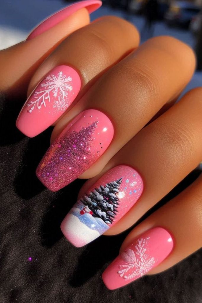 For those who love a bold and glittery look, this design features pink coffin nails with striking glitter and nail art. The accent nails showcase pink Christmas trees and snowflakes, making this design perfect for holiday celebrations. The combination of bold glitter and soft snowflake details strikes a balance between playful and glamorous, ensuring your nails will stand out at any festive event.