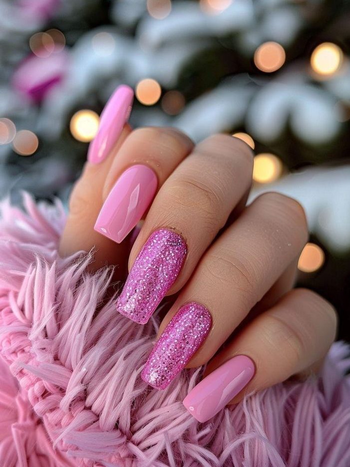 These square-shaped nails blend glossy pink polish with dazzling glitter on a single accent nail, creating a festive, sparkling look. The balance between the glitter and simple pink polish keeps it playful without overwhelming the overall design. It’s an ideal choice for anyone wanting to add a bit of shine to their holiday outfit while keeping things relatively simple and stylish. The look works well for any occasion, from office parties to cozy nights in.