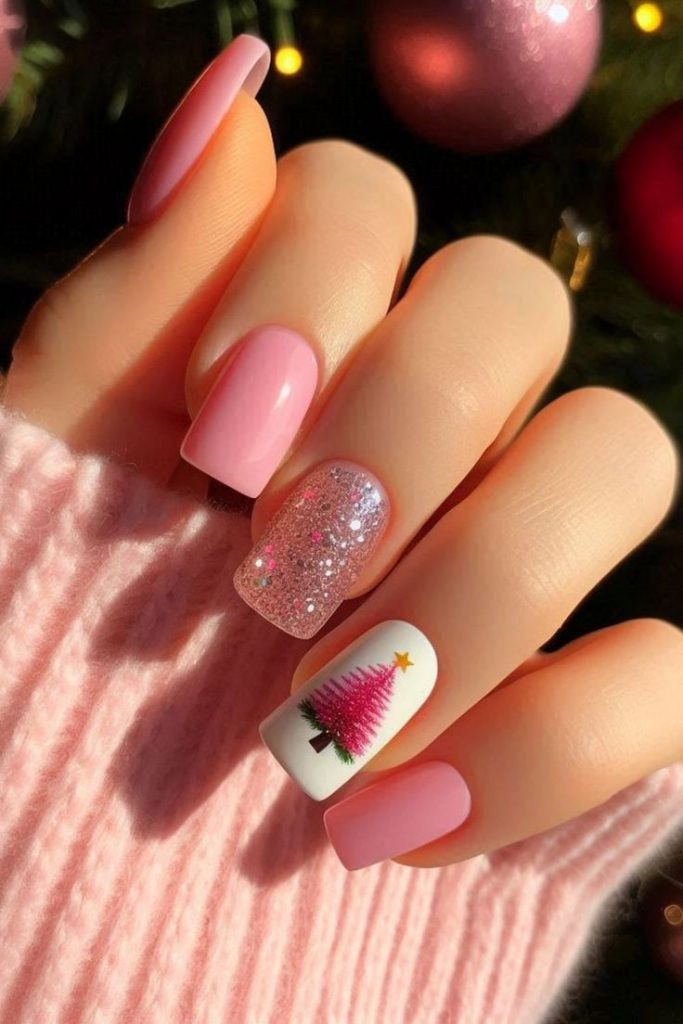 This set combines glitter and nail art for a joyful holiday vibe. The accent nail features a hand-painted pink Christmas tree, making this design particularly fun and festive. The balance between matte pink nails and a touch of glitter on one accent nail makes it an excellent choice for the holiday season. This square nail design is both cute and creative, perfect for a family gathering or a day out shopping for gifts.