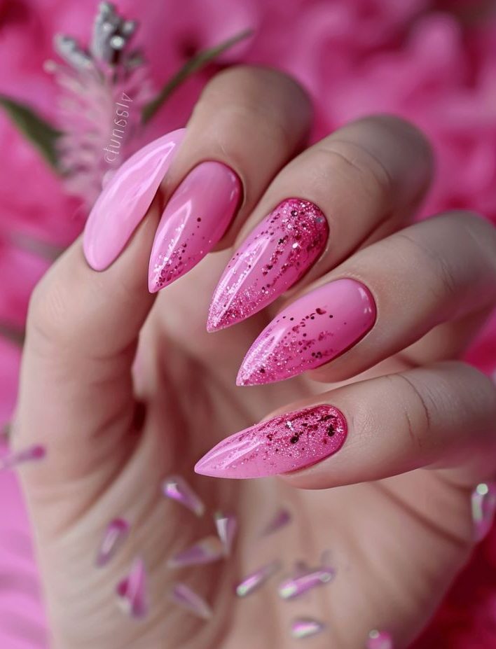 This almond nail design features bold, glossy pink nails with glitter gradients on a couple of accent nails. The sparkling finish makes this style an eye-catcher for winter parties. Whether you’re dressing up for a New Year’s Eve event or adding sparkle to your daily winter look, these nails bring a lively and festive touch.
