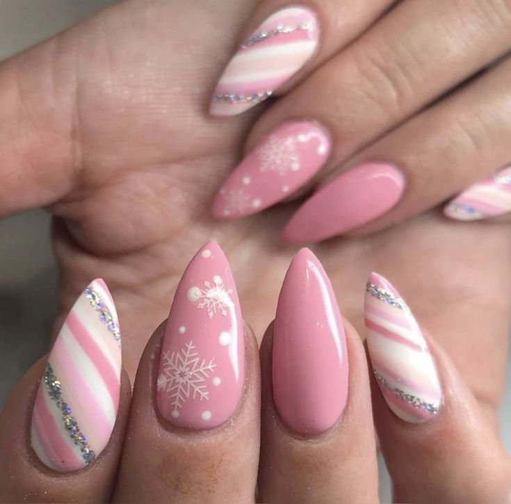 This playful design combines acrylic almond nails with a candy-cane-inspired theme. The soft pink base is decorated with snowflakes and white stripes, creating a festive yet feminine look. The addition of glitter accents along the striped nails adds a touch of sparkle without overwhelming the design. The almond shape is perfect for elongating the fingers while keeping the overall style sophisticated. This design works well for those who love subtle Christmas vibes without going too bold.