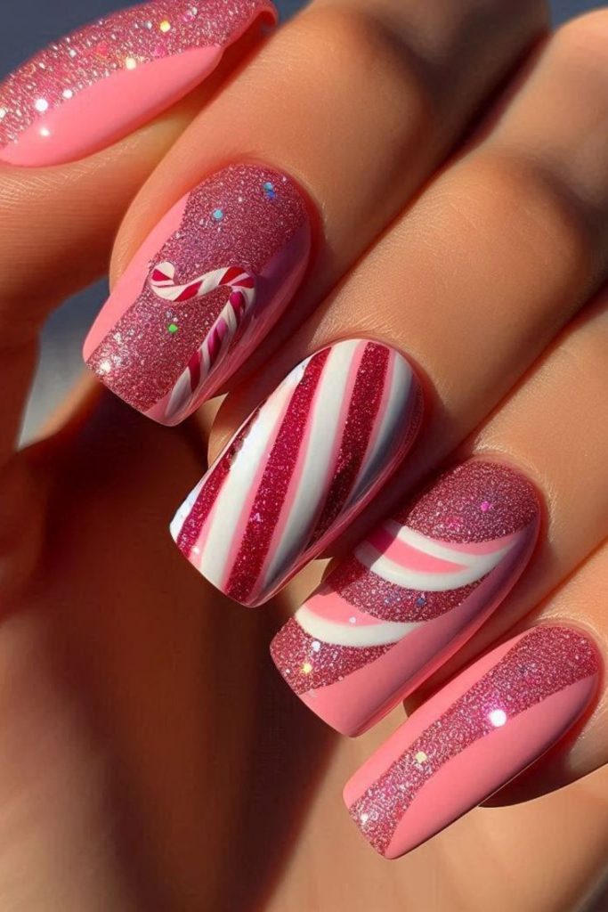 Celebrate the holiday season with this square nail design that incorporates candy cane stripes with glitter. The pink base is complemented by sparkling red and white stripes, giving a fun and festive look perfect for Christmas parties. The glitter accent nails add a glamorous touch to the design, making it playful yet polished. Ideal for anyone looking to combine holiday spirit with a bit of sparkle.