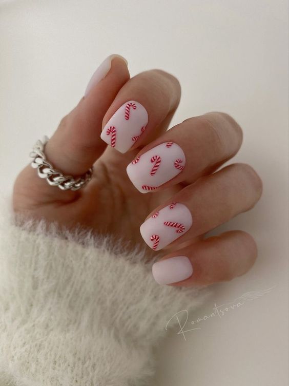 Sometimes, less is more. This acrylic short nail design features a pale pink base with minimalist candy cane art. Ideal for those who prefer simple and understated designs, the short nails keep the look practical while the red-and-white candy canes add a playful holiday touch. These nails are perfect for everyday wear and would go well with cozy winter sweaters and festive outfits.