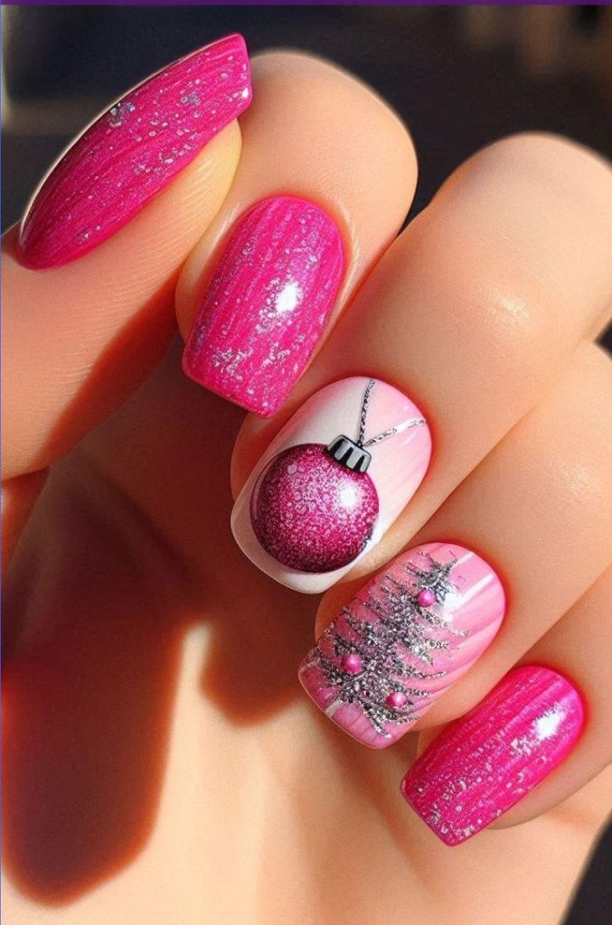 Looking for something playful and full of holiday spirit? This design features bright glitter and pink ornament decorations paired with a silver Christmas tree art. The square shape allows for detailed artwork on the nails, while the pink color keeps it fun and vibrant. This set is perfect for holiday parties or gatherings, pairing beautifully with festive outfits.