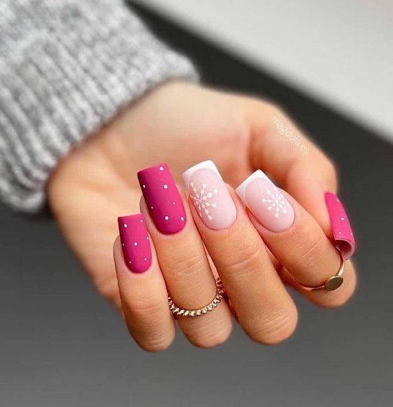 This chic square-shaped design mixes bold fuchsia pink nails with delicate snowflake detailing on french tip nails. The soft pale pink base contrasts beautifully with the bright white snowflakes, bringing winter’s magic to life. Dotted nails on the fuchsia add a playful yet sophisticated twist, making this style a favorite for casual winter events or even cozying up at home. The smooth acrylic finish ensures durability throughout the season.